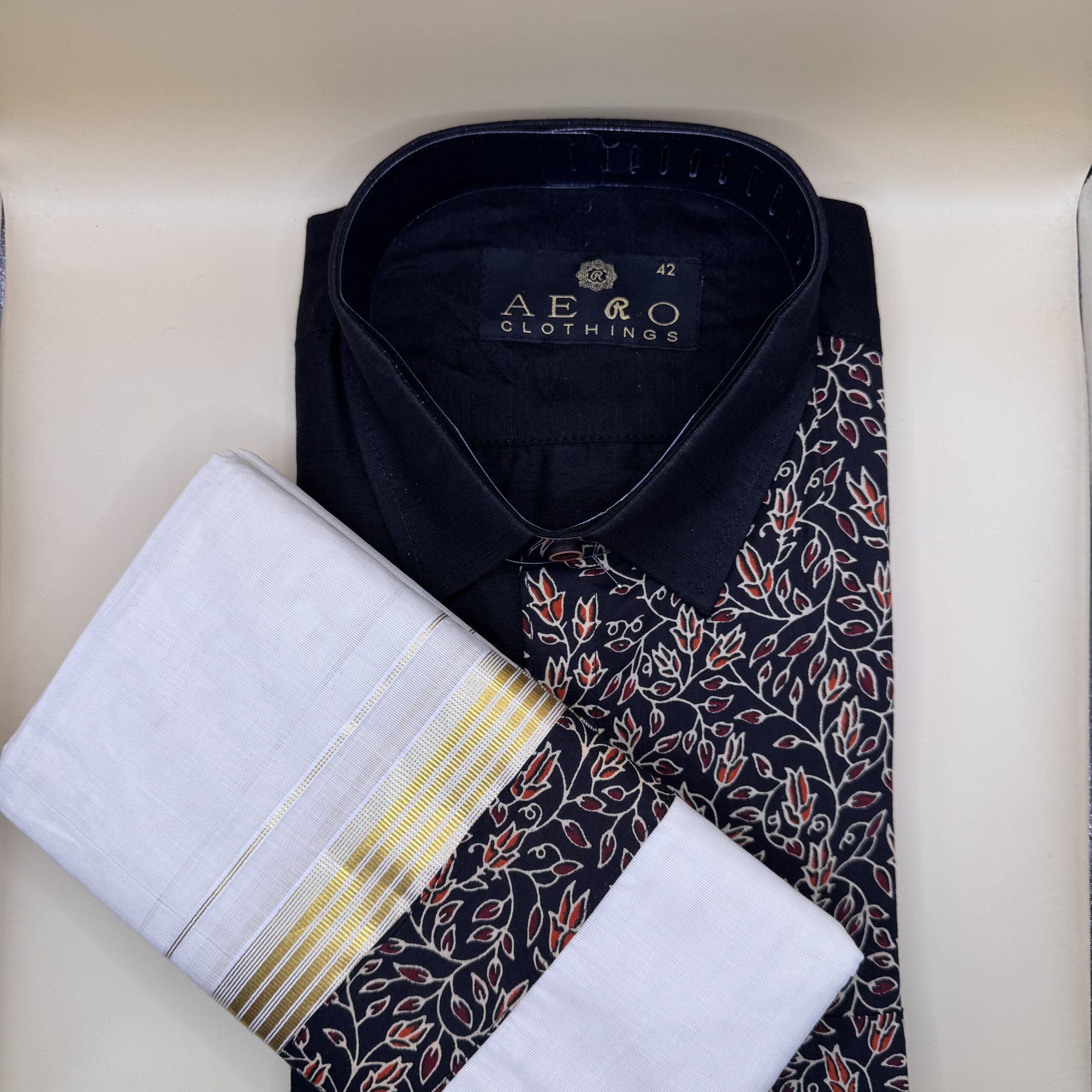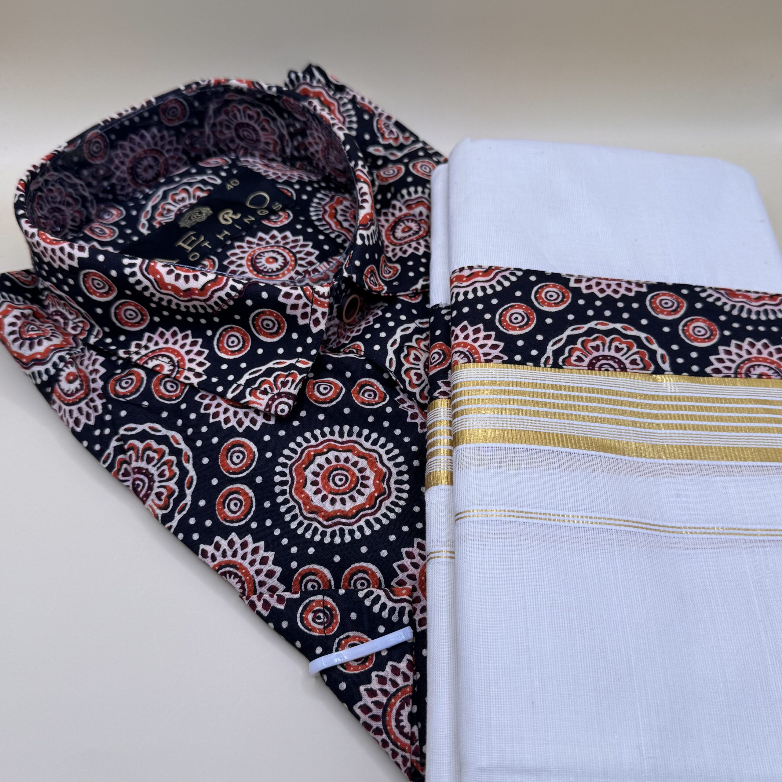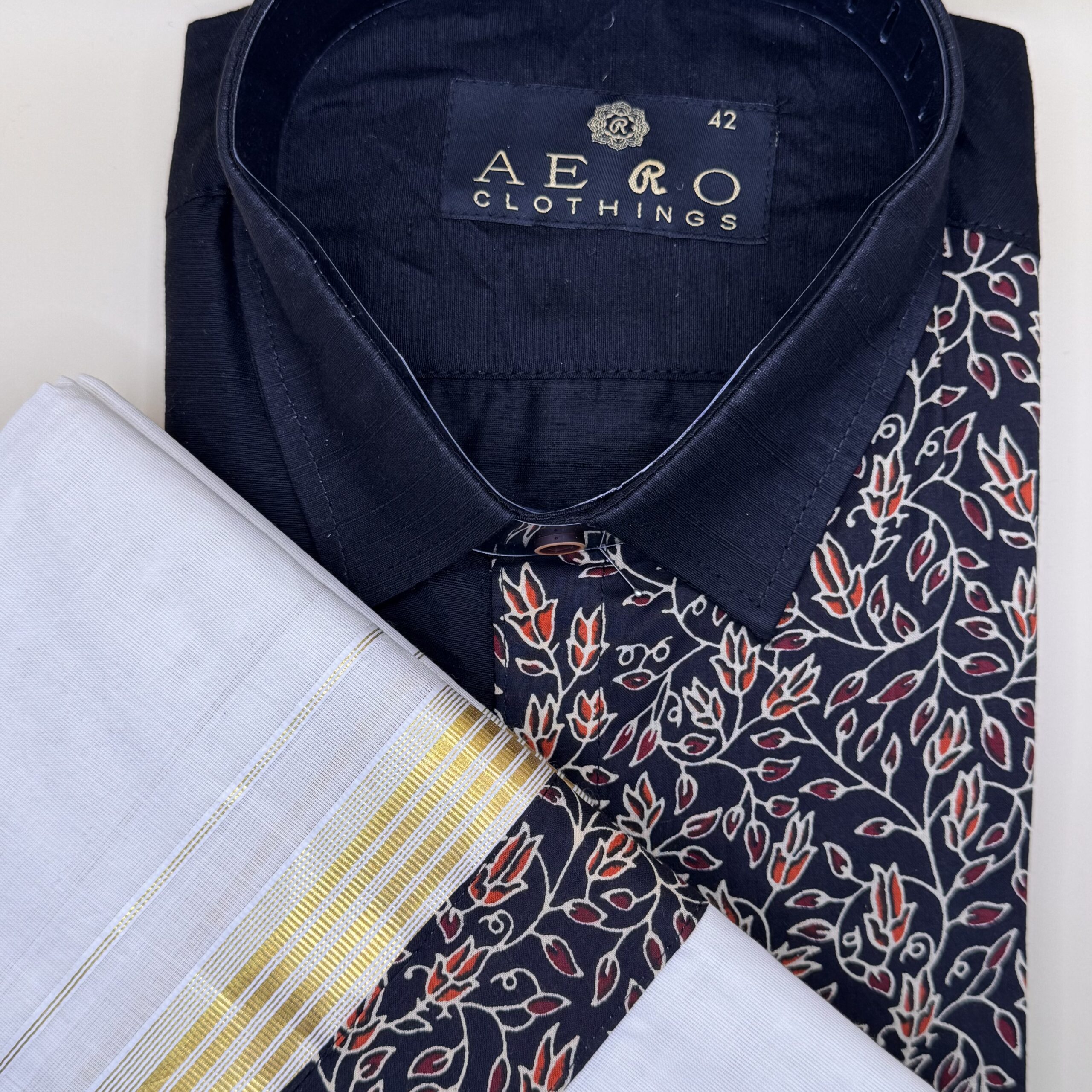 Embrace tradition with a modern twist in this Black Printed Shirt & Mundu set. The black shirt features an elegant floral print in red and beige, adding a touch of contemporary flair, while the classic Kerala mundu with its golden kasavu border completes the look with timeless charm. Perfect for Onam, weddings, and festive occasions, this combo blends ethnic elegance with stylish sophistication.
