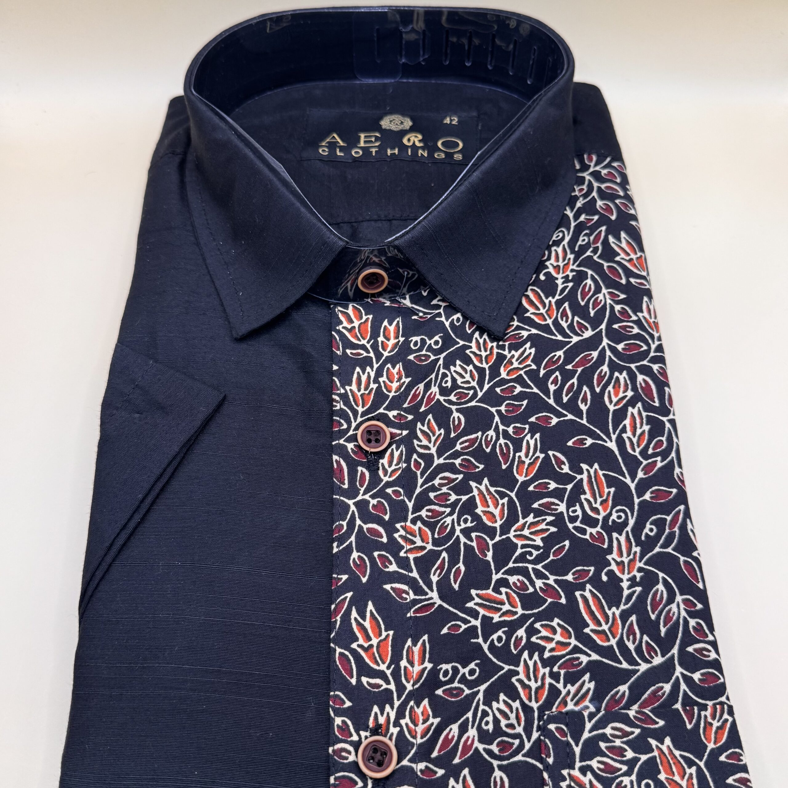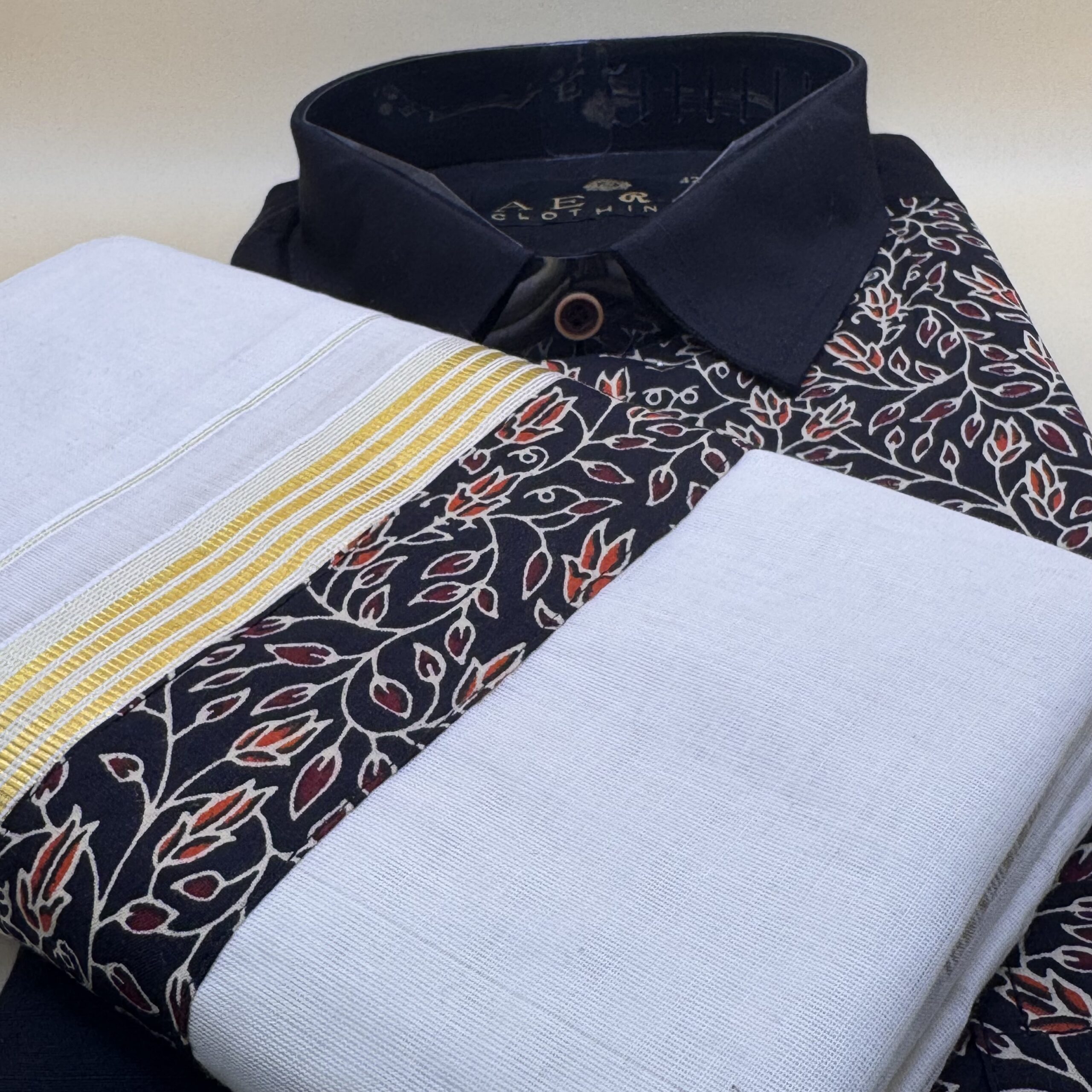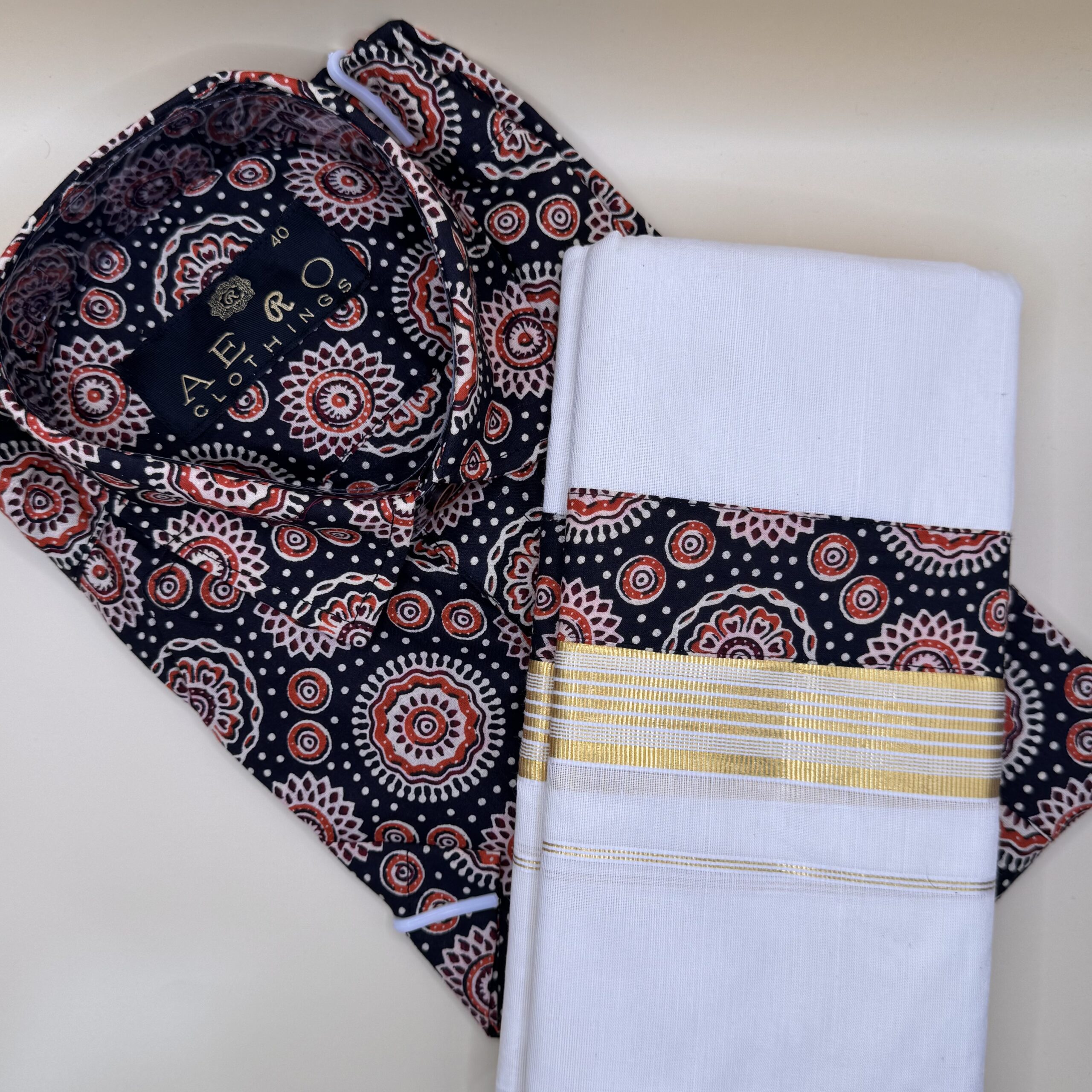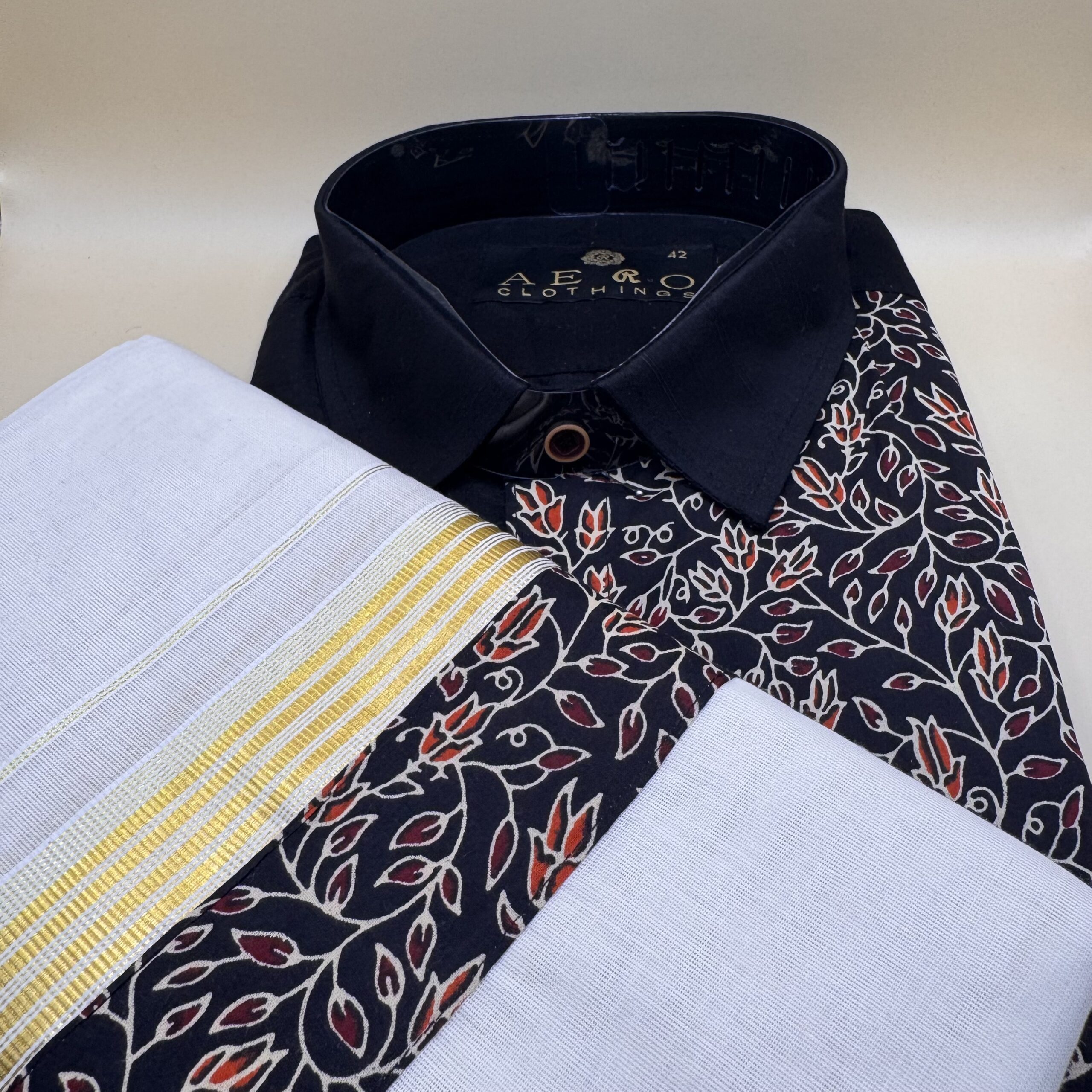 Embrace tradition with a modern twist in this Black Printed Shirt & Mundu set. The black shirt features an elegant floral print in red and beige, adding a touch of contemporary flair, while the classic Kerala mundu with its golden kasavu border completes the look with timeless charm. Perfect for Onam, weddings, and festive occasions, this combo blends ethnic elegance with stylish sophistication.