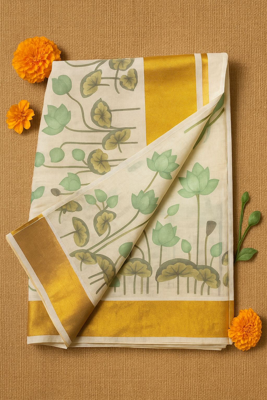 A graceful blend of traditional handloom with contemporary floral charm. Woven from premium quality pure cotton handloom fabric, ensuring breathability and comfort. Beautiful all-over floral digital prints add a modern touch to this traditional saree. Perfect for Onam, weddings, cultural celebrations, or elegant casual outings. Saree length 6.25 meters