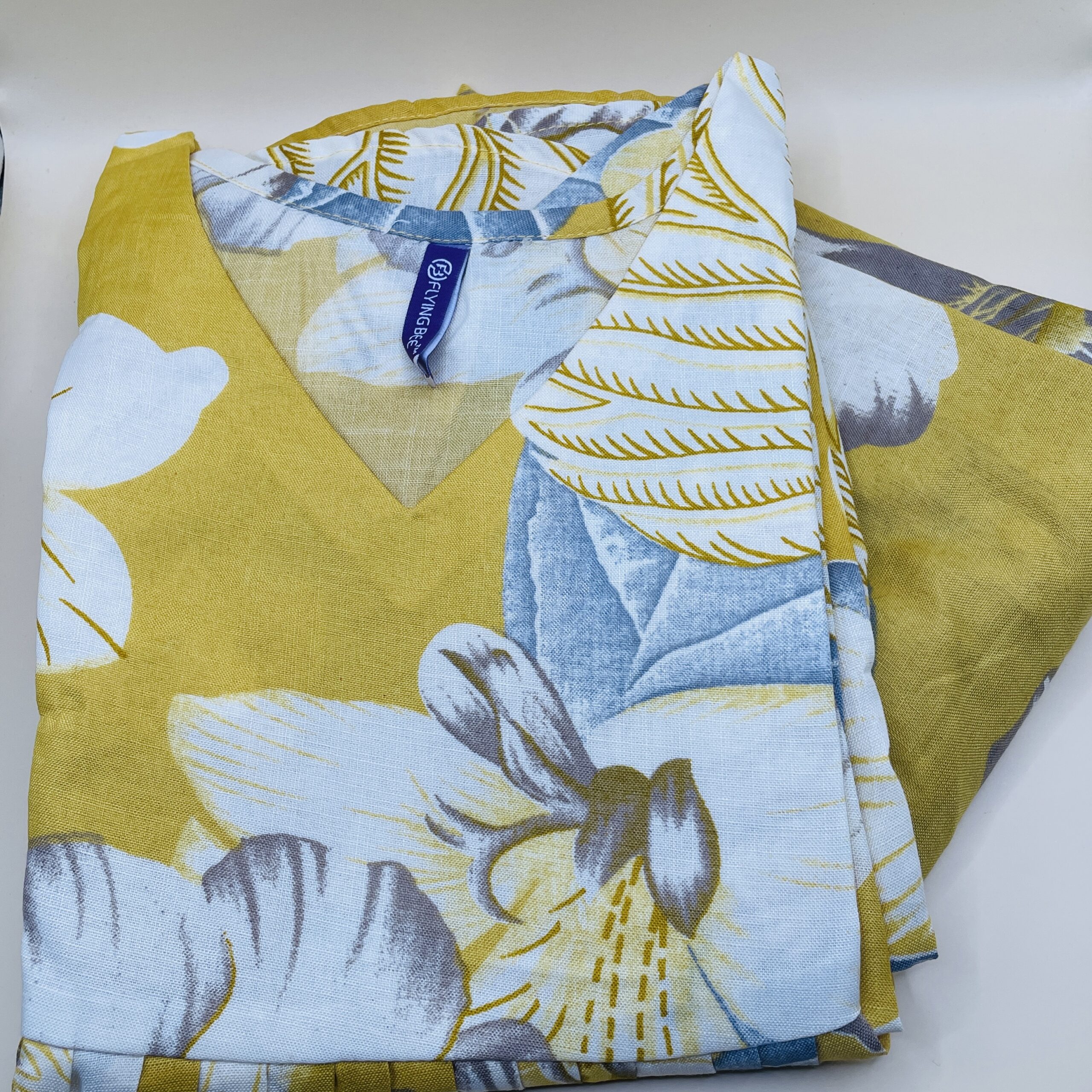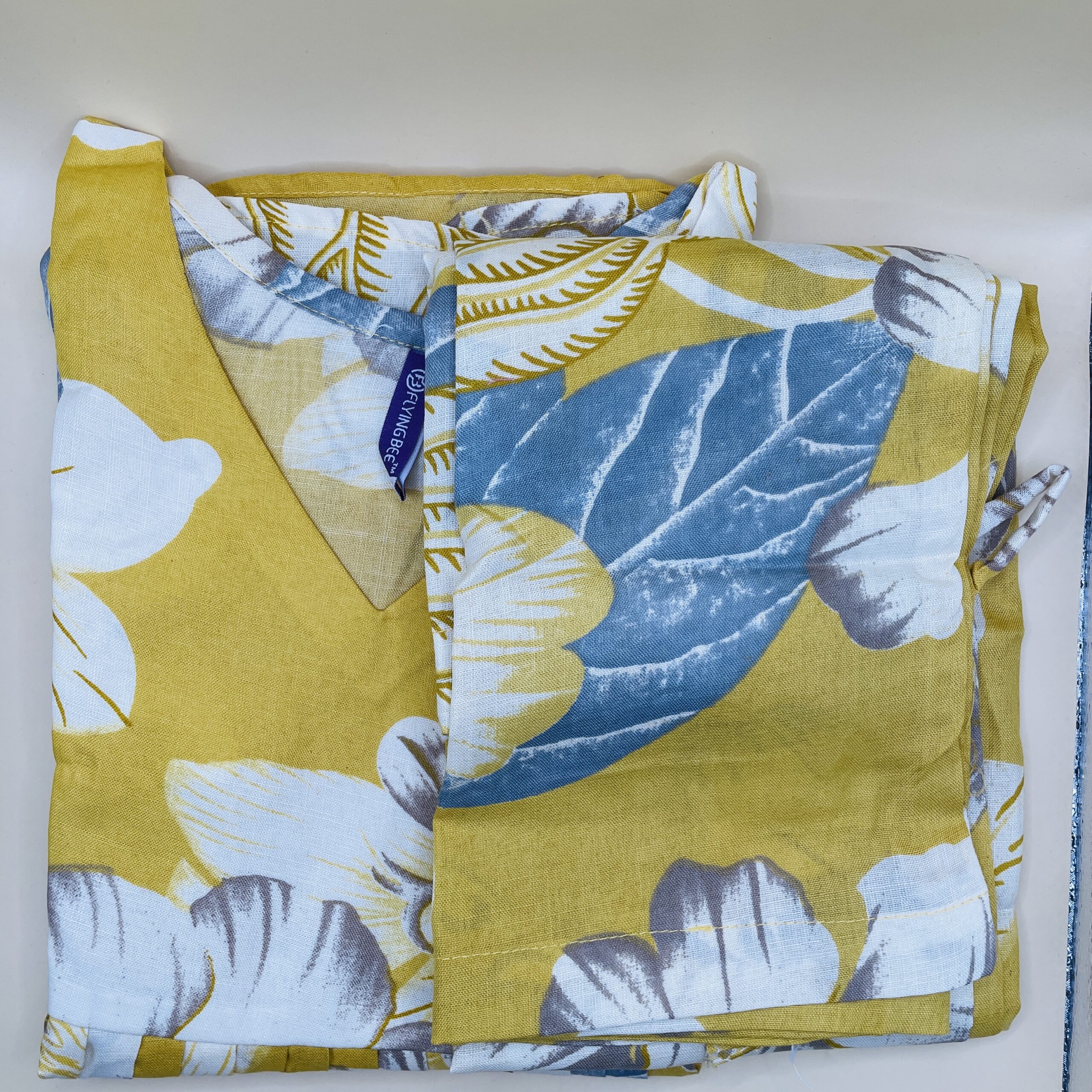 Brighten up your wardrobe with this vibrant yellow kurta set, beautifully adorned with blue and white tropical floral prints. Made from soft, breathable cotton, this set includes a V-neck top and coordinated bottoms, offering a perfect balance of comfort and chic style. The bold floral patterns make it an ideal choice for summer outings, vacations, and casual gatherings.