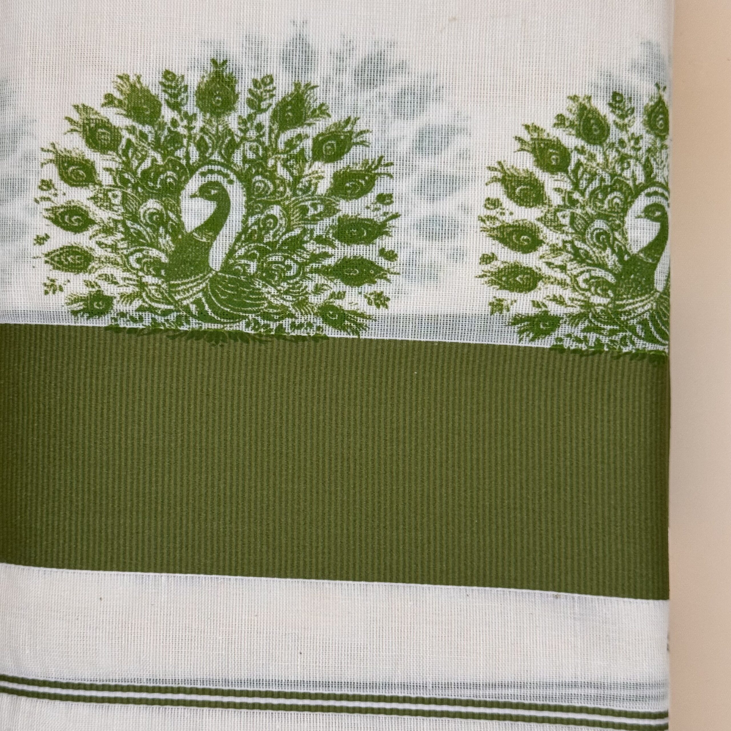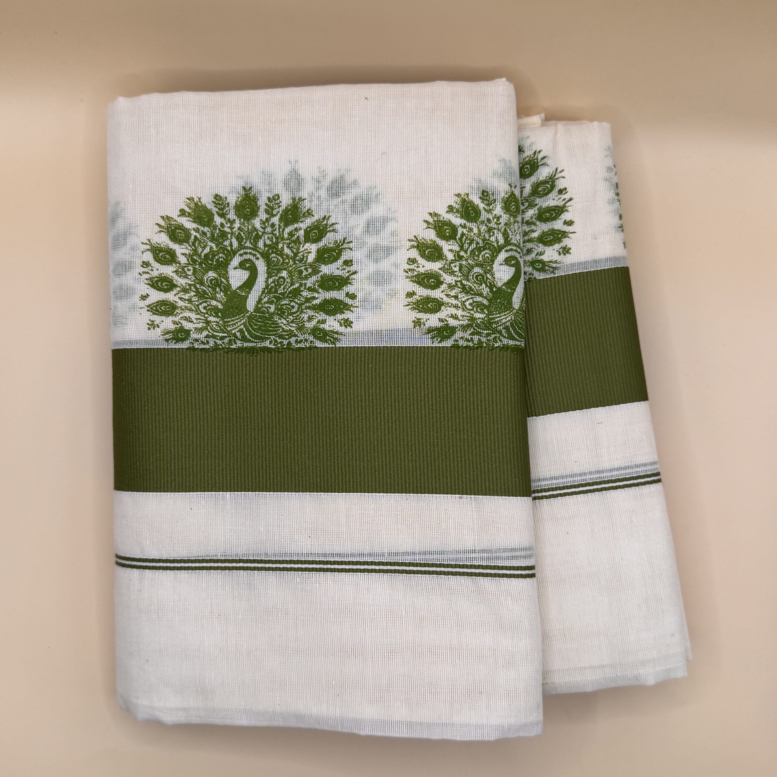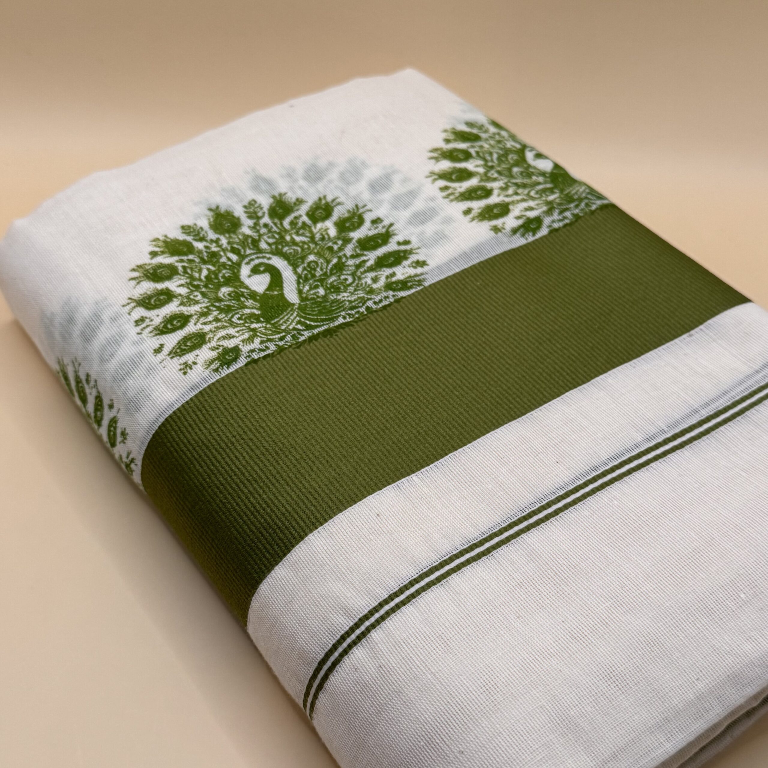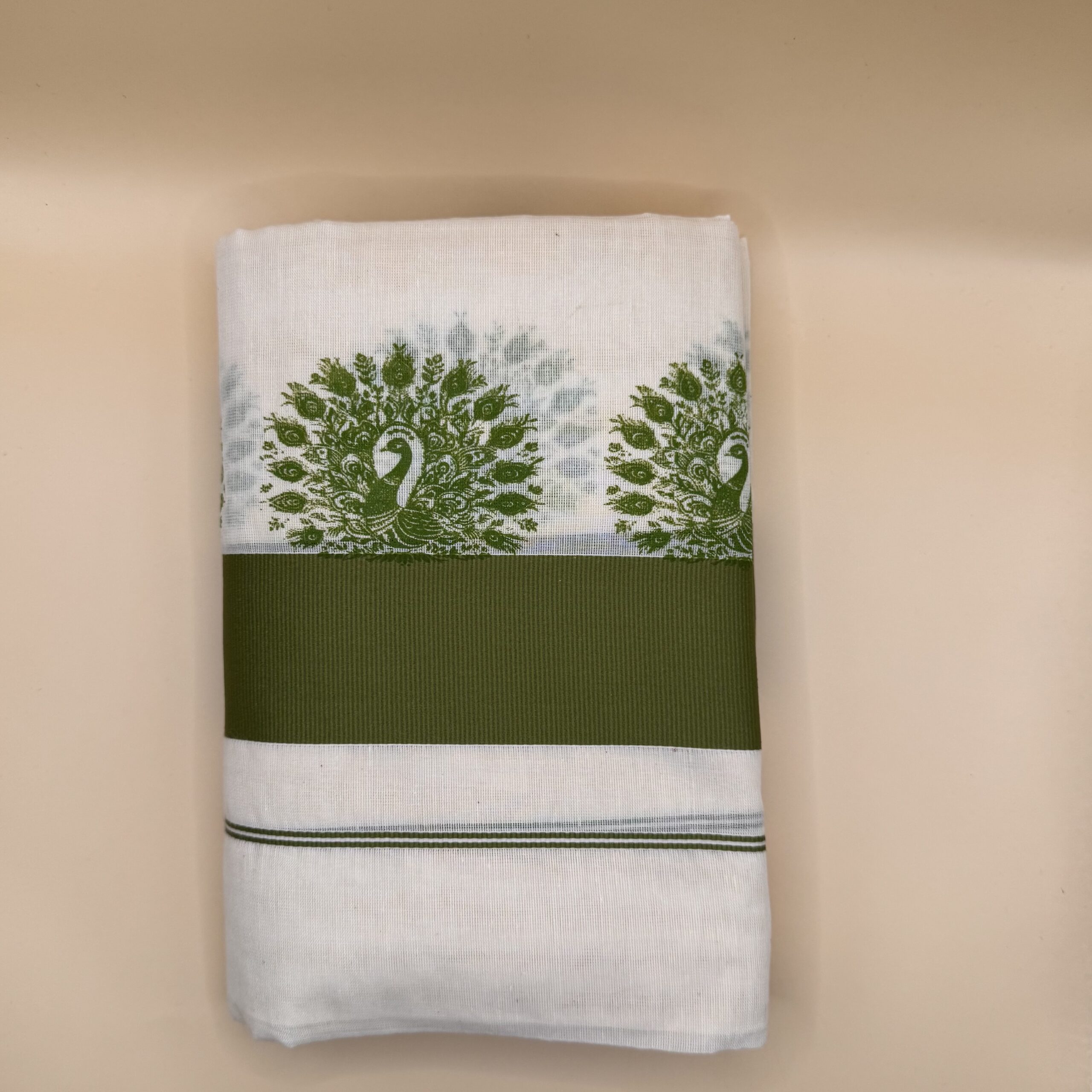 Perfect for women who want to carry the essence of Kerala’s tradition with a modern printed twist.Features a graceful peacock motif symbolizing beauty, grace, and prosperity. Set mundu length – 2.8meters