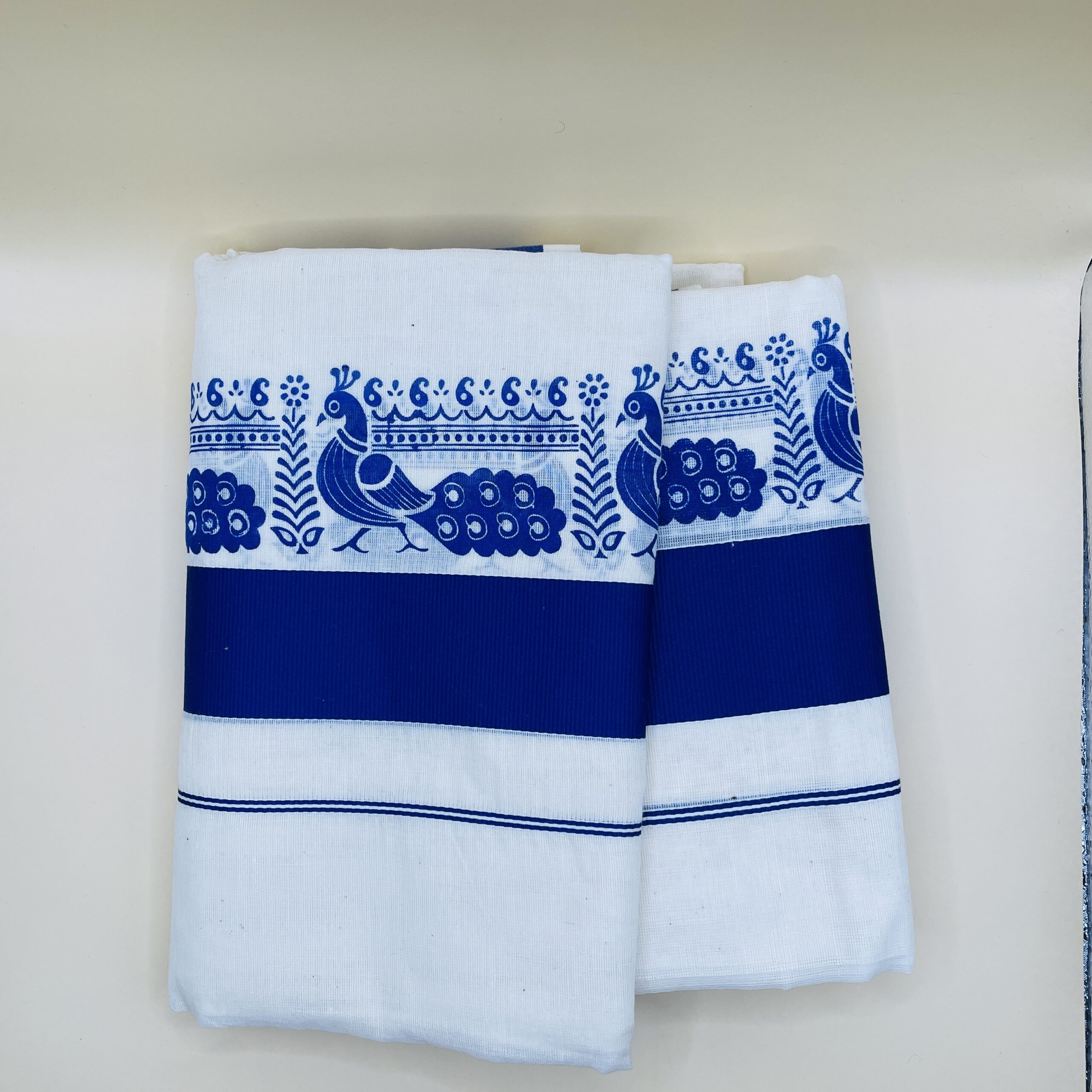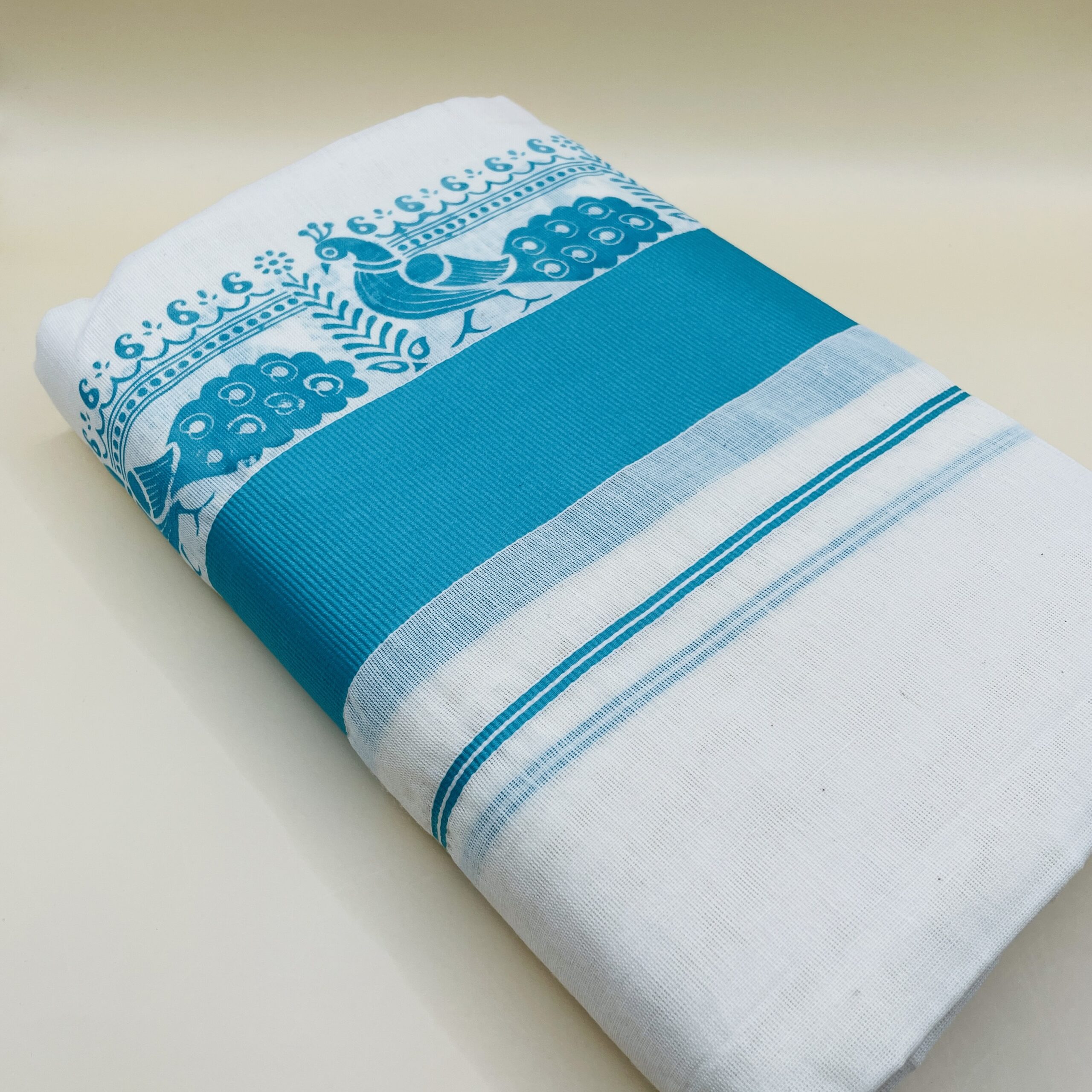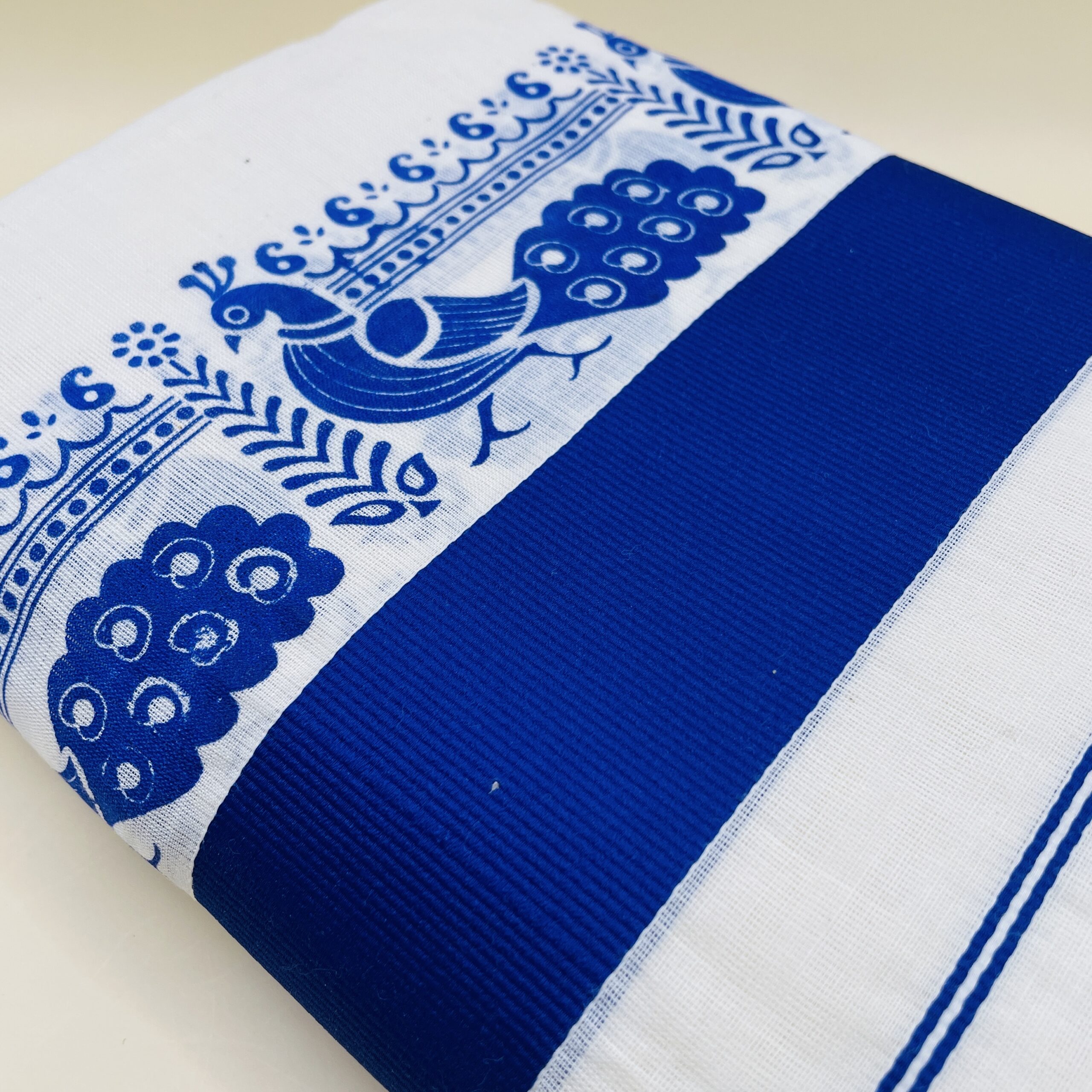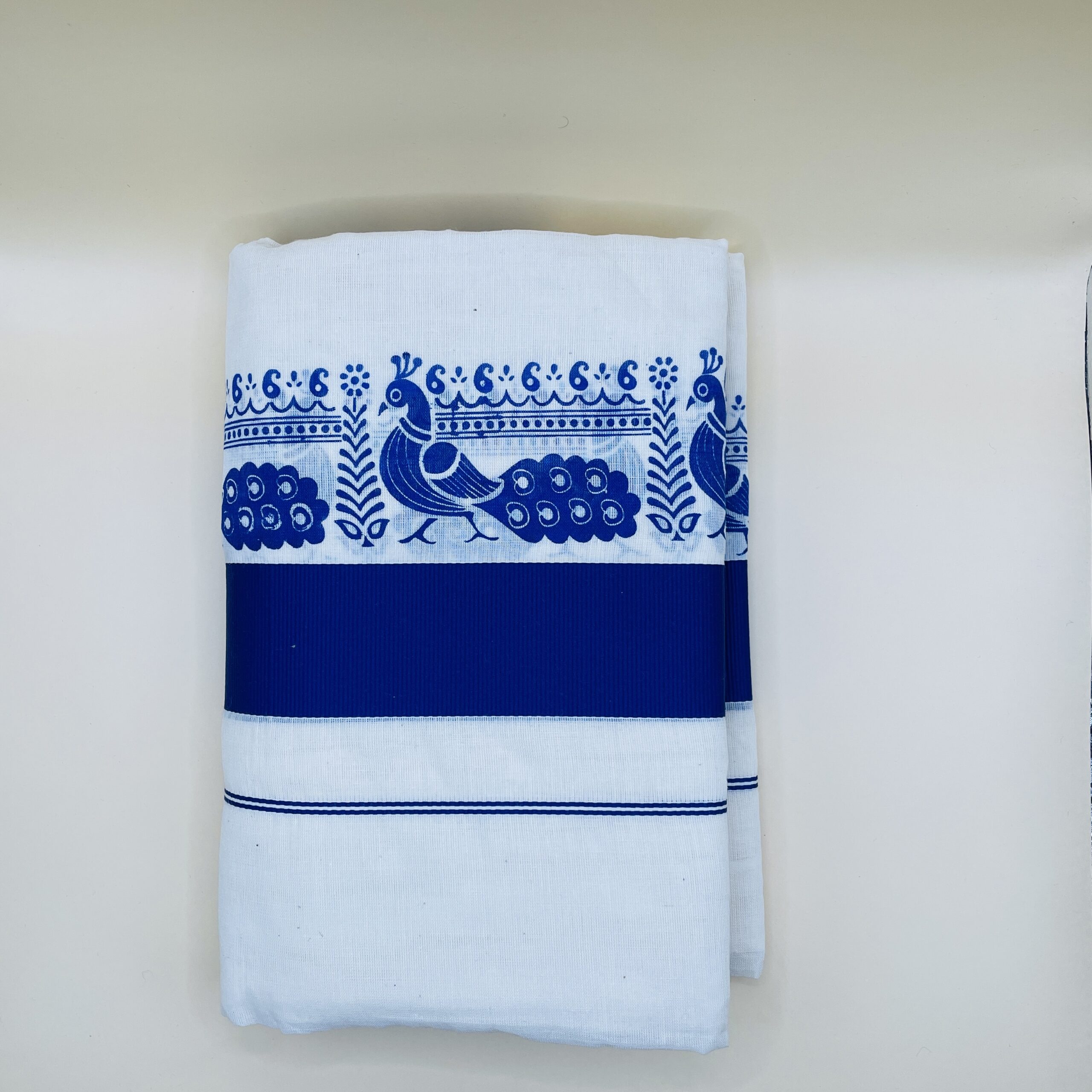 Perfect for women who want to carry the essence of Kerala’s tradition with a modern printed twist.Features a graceful peacock motif symbolizing beauty, grace, and prosperity. Set mundu length – 2.8meters
