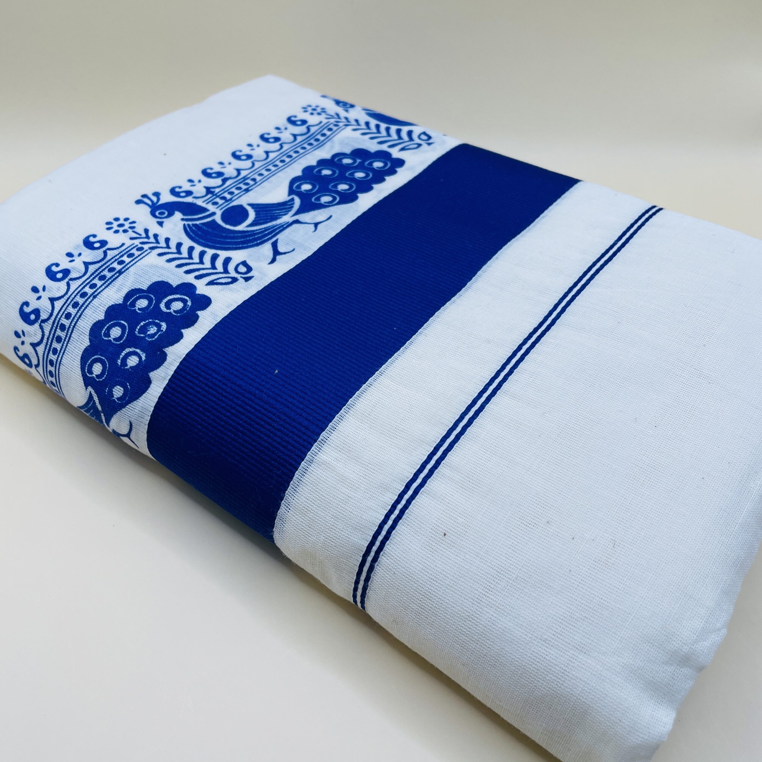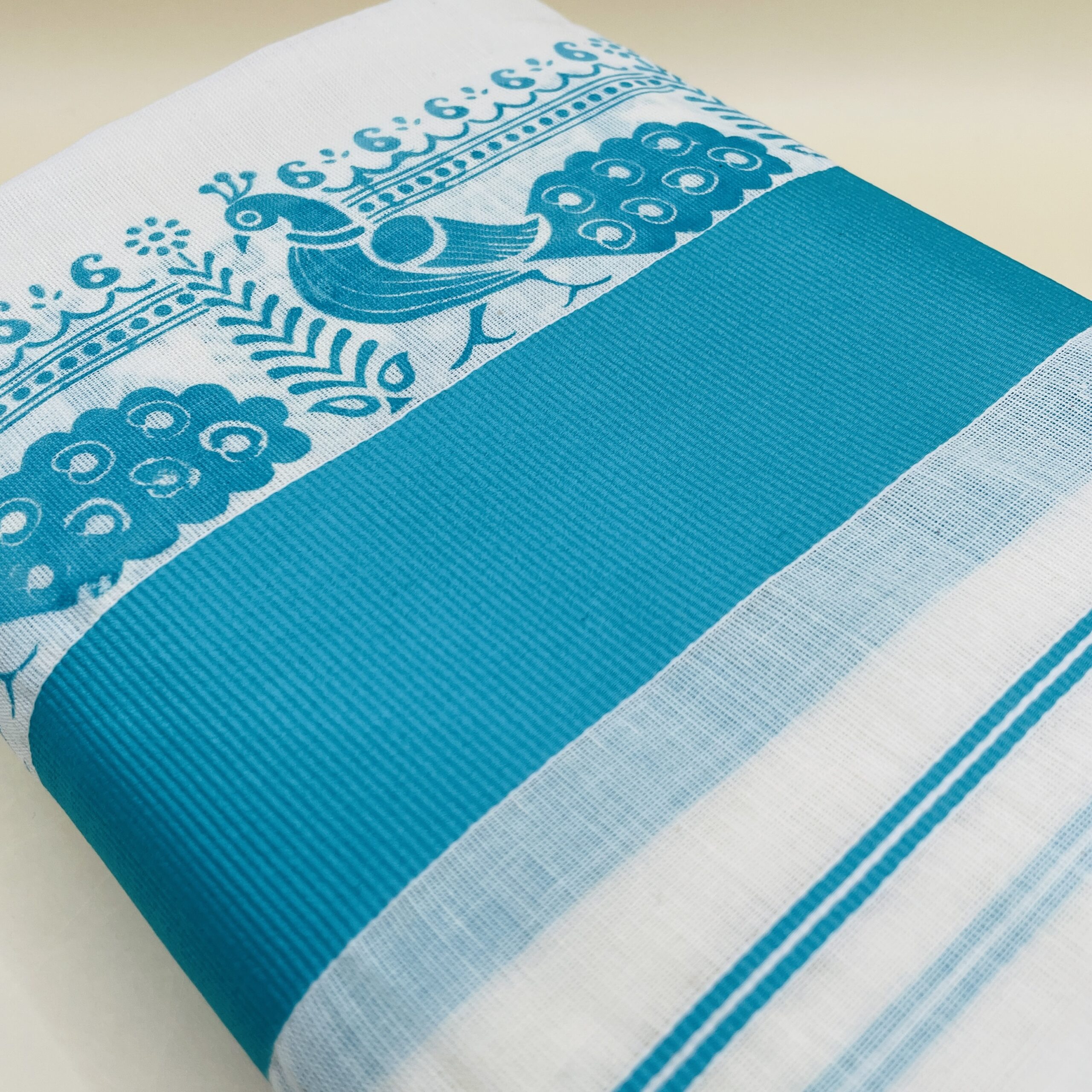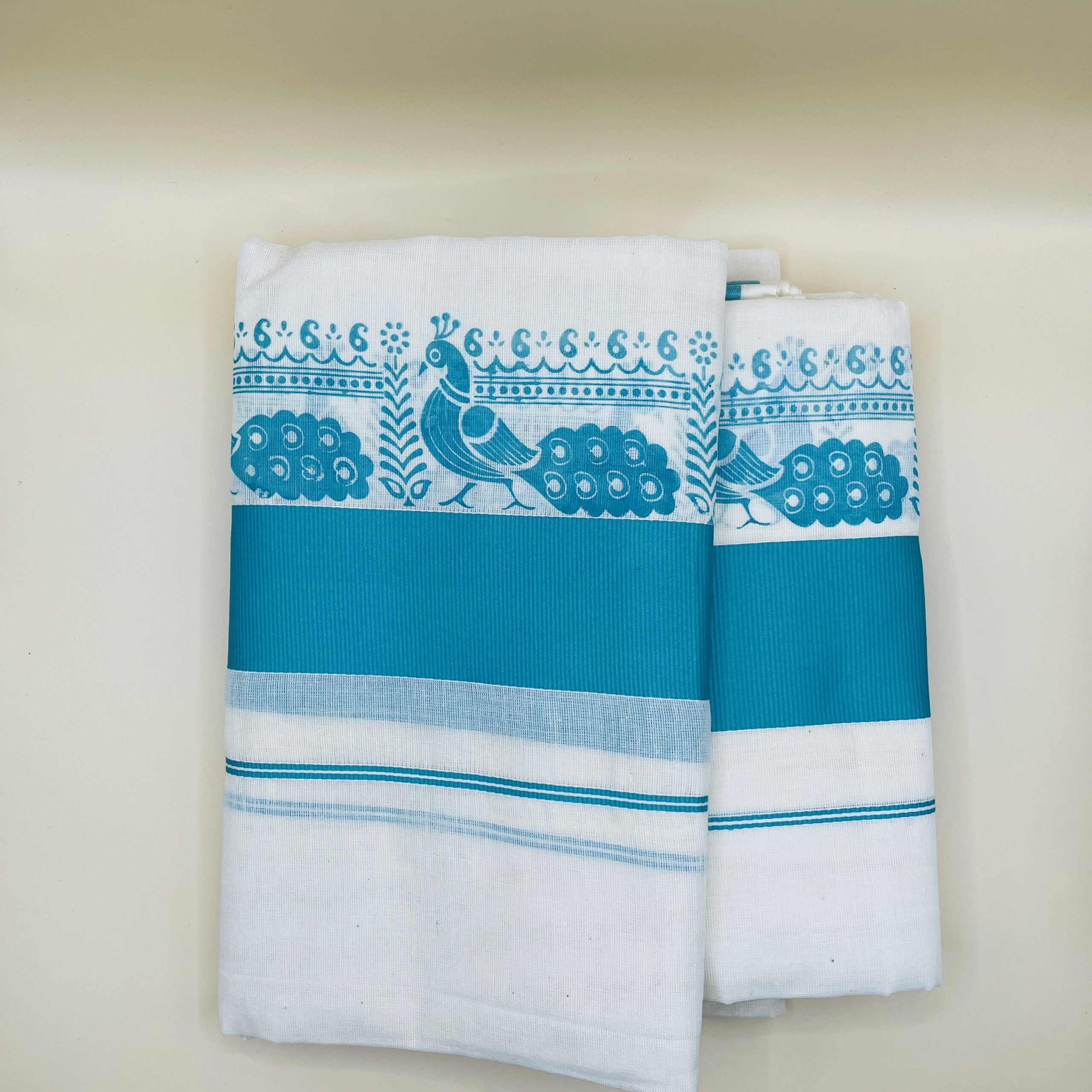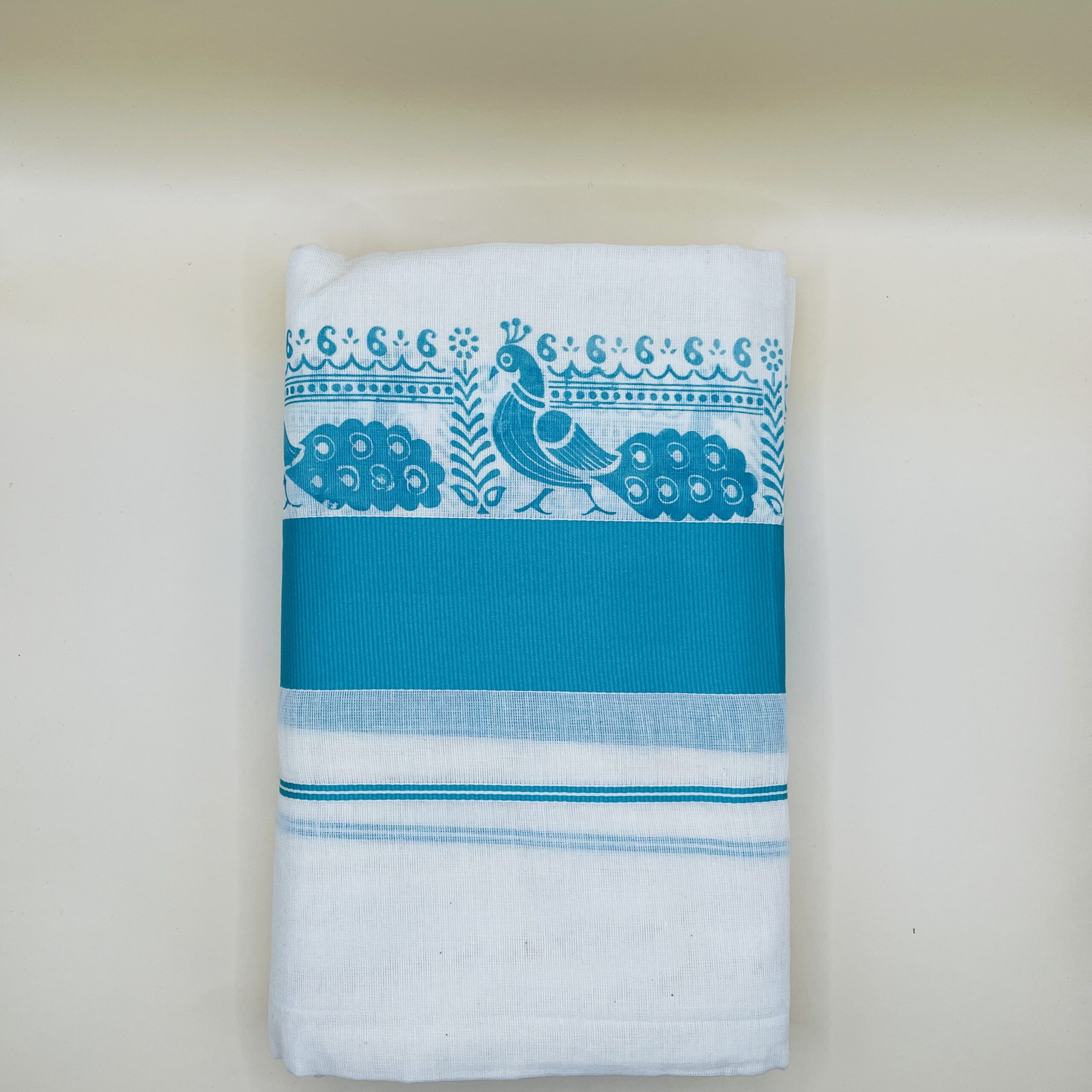 Perfect for women who want to carry the essence of Kerala’s tradition with a modern printed twist.Features a graceful peacock motif symbolizing beauty, grace, and prosperity. Set mundu length – 2.8meters