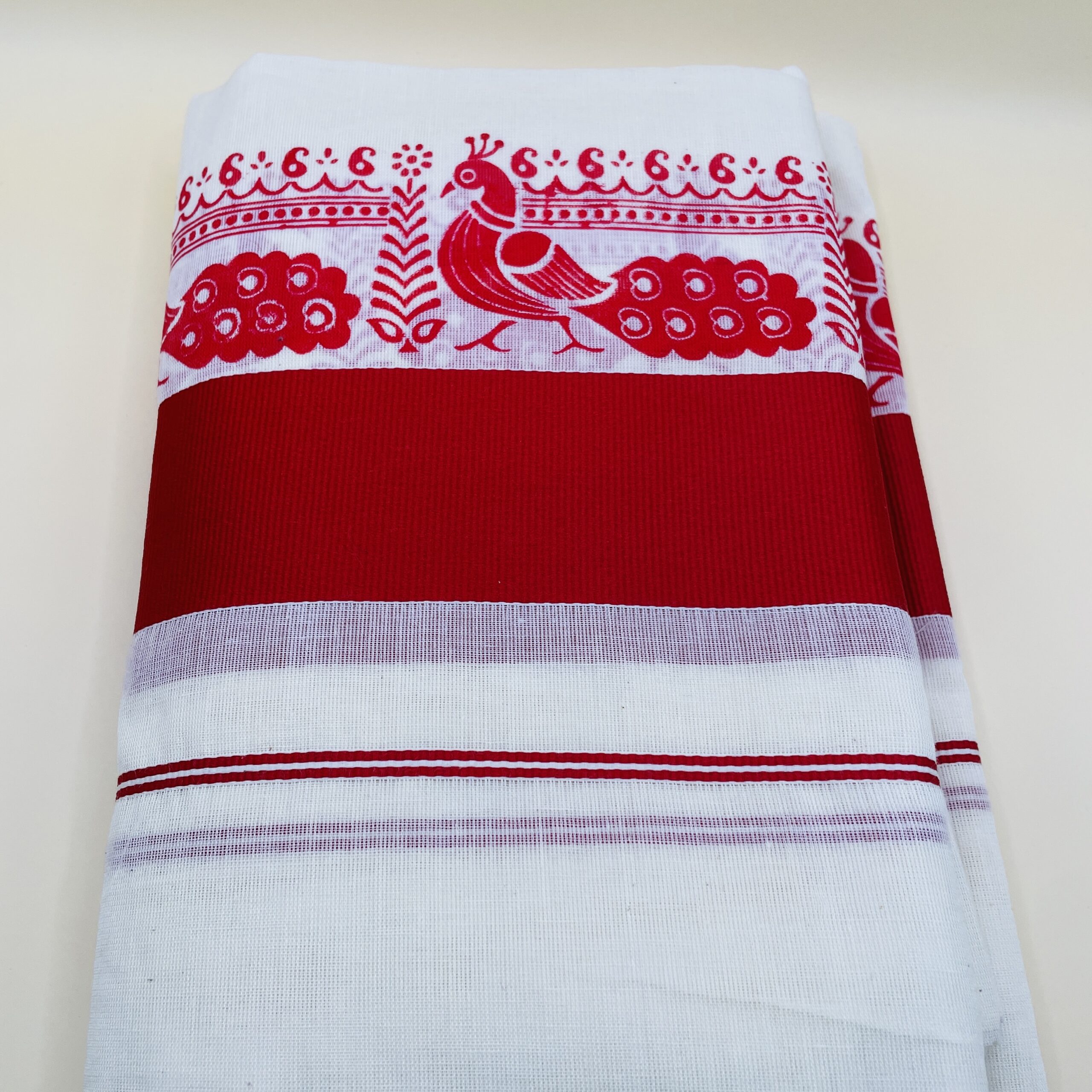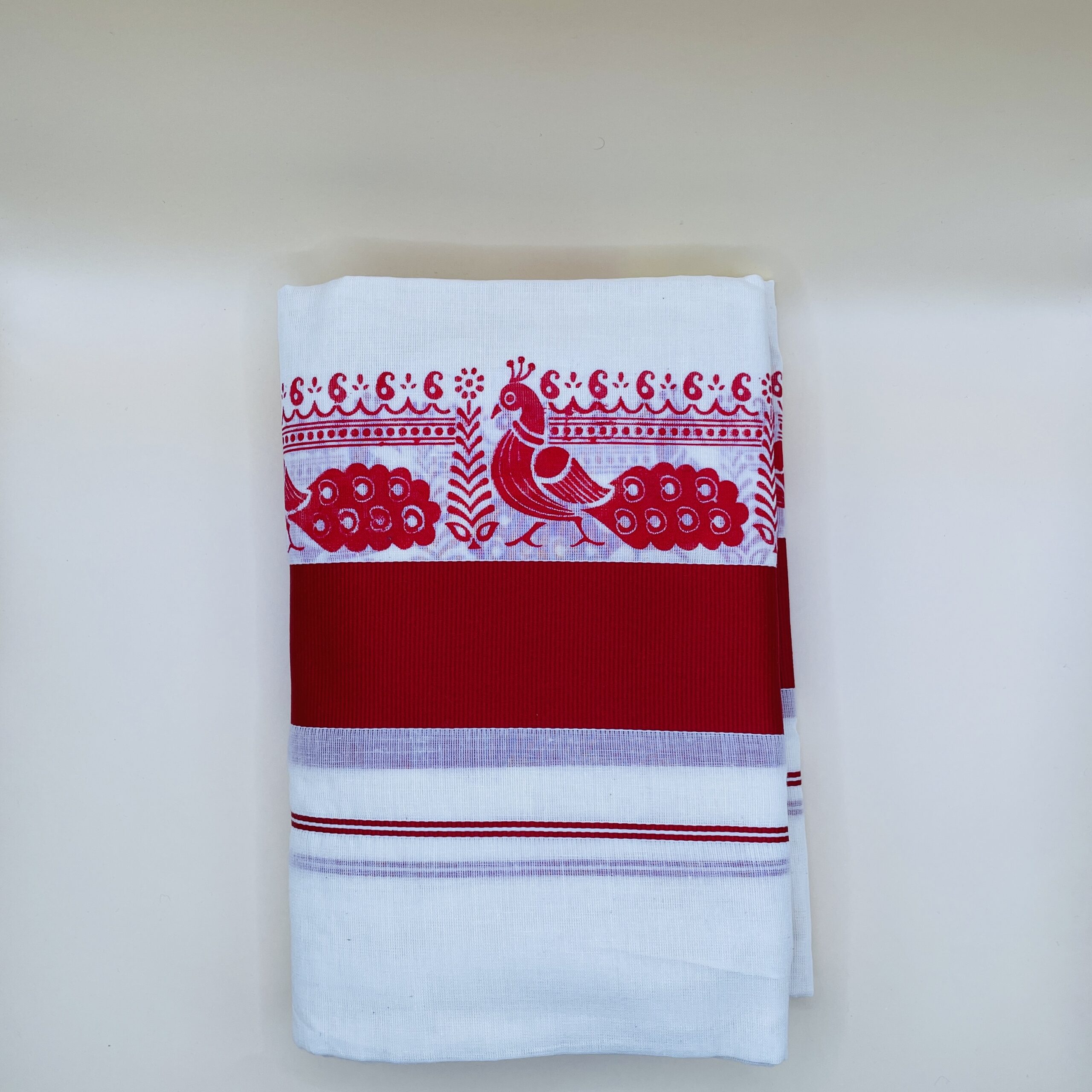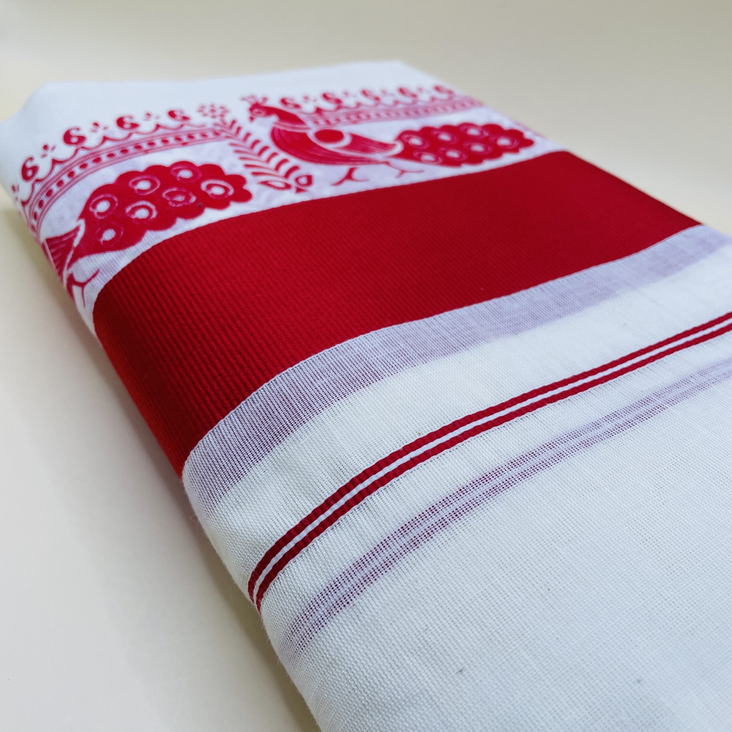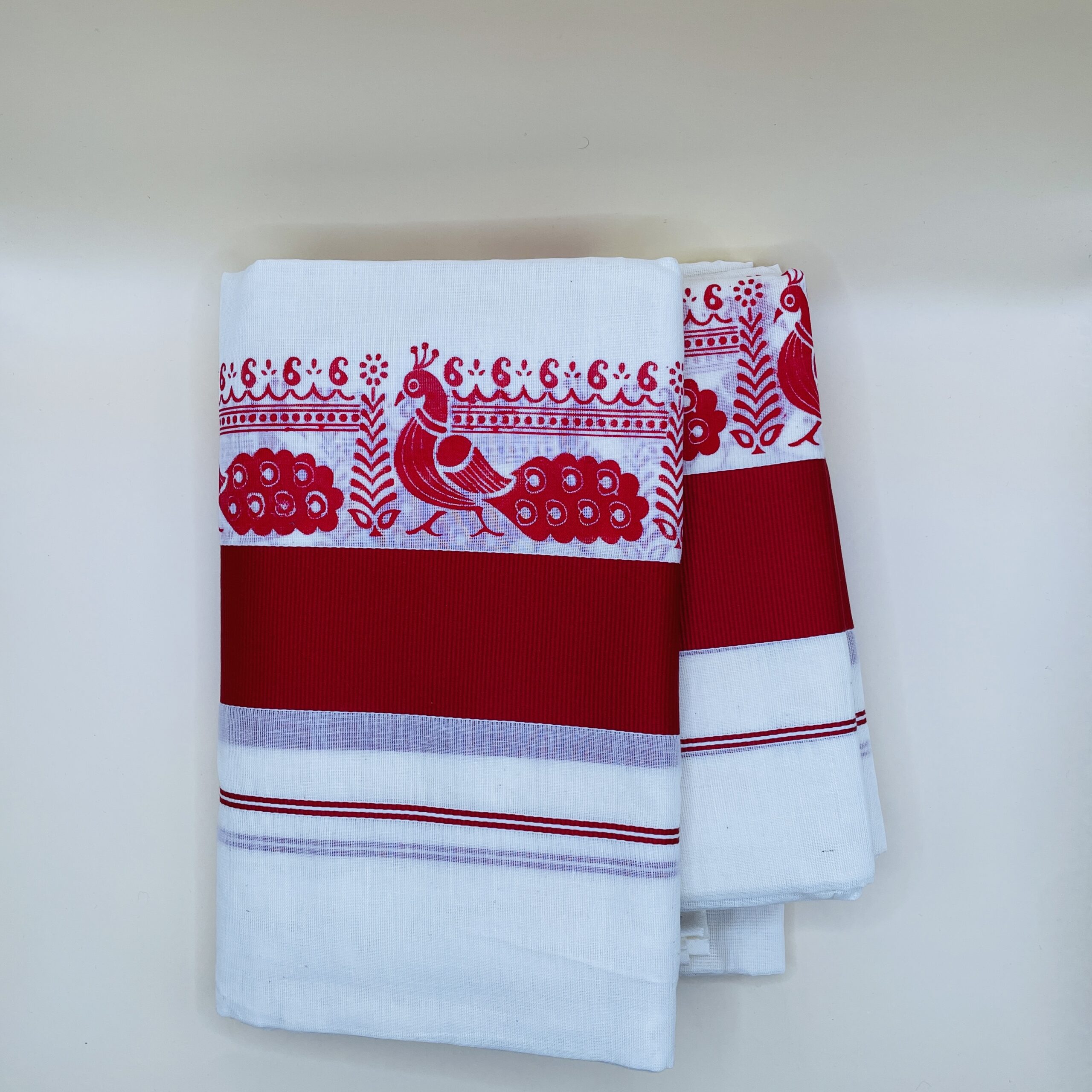 Perfect for women who want to carry the essence of Kerala’s tradition with a modern printed twist.Features a graceful peacock motif symbolizing beauty, grace, and prosperity. Set mundu length – 2.8meters
