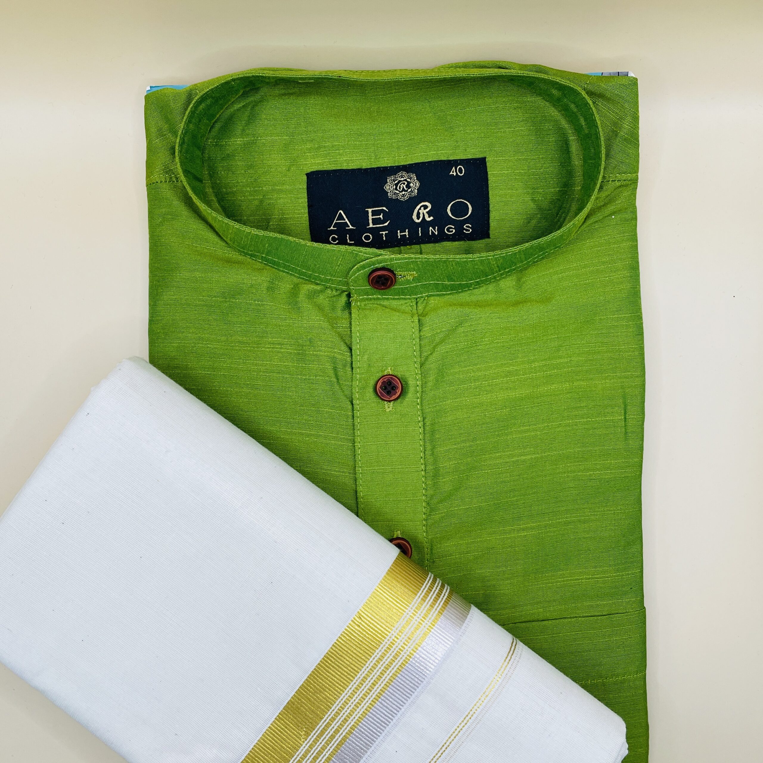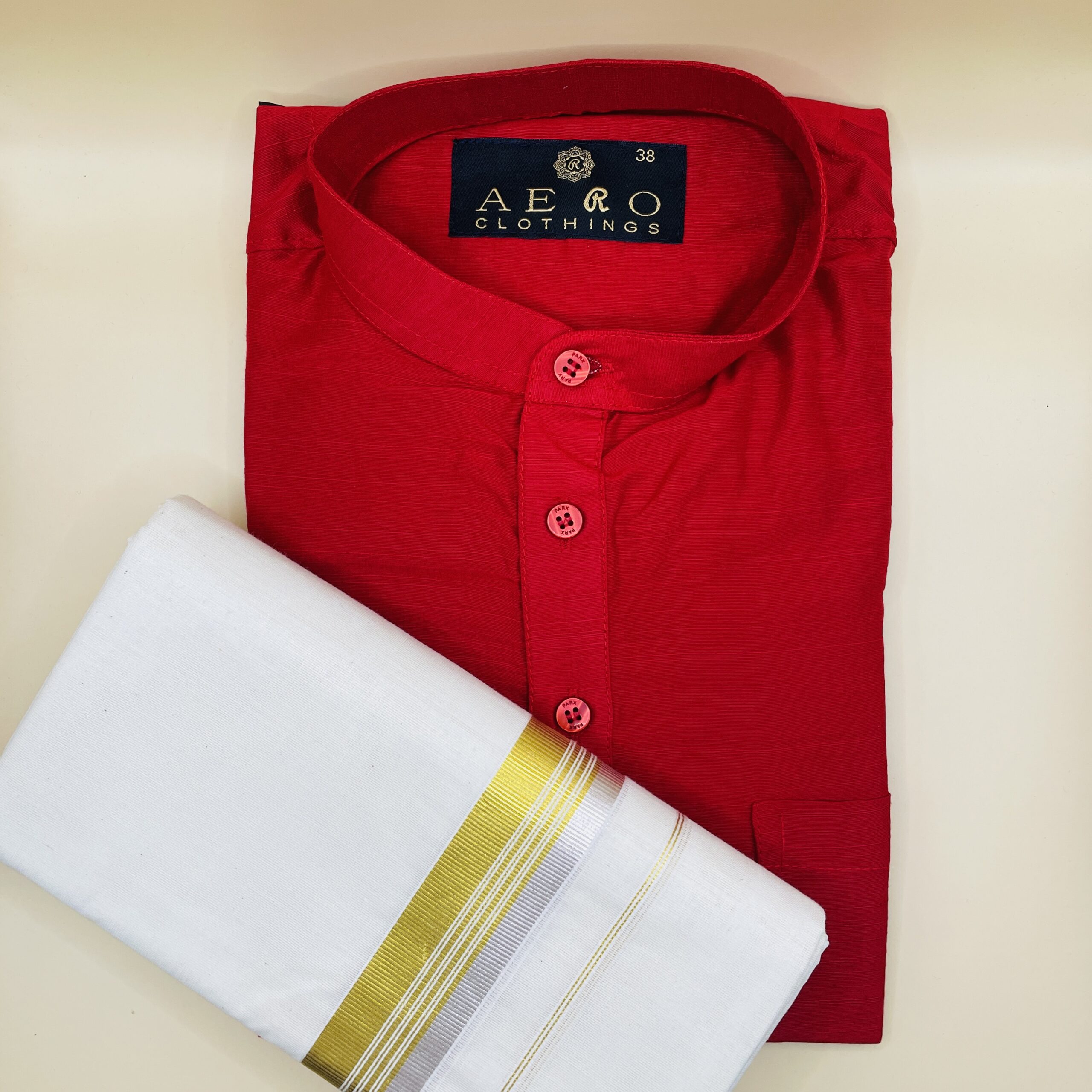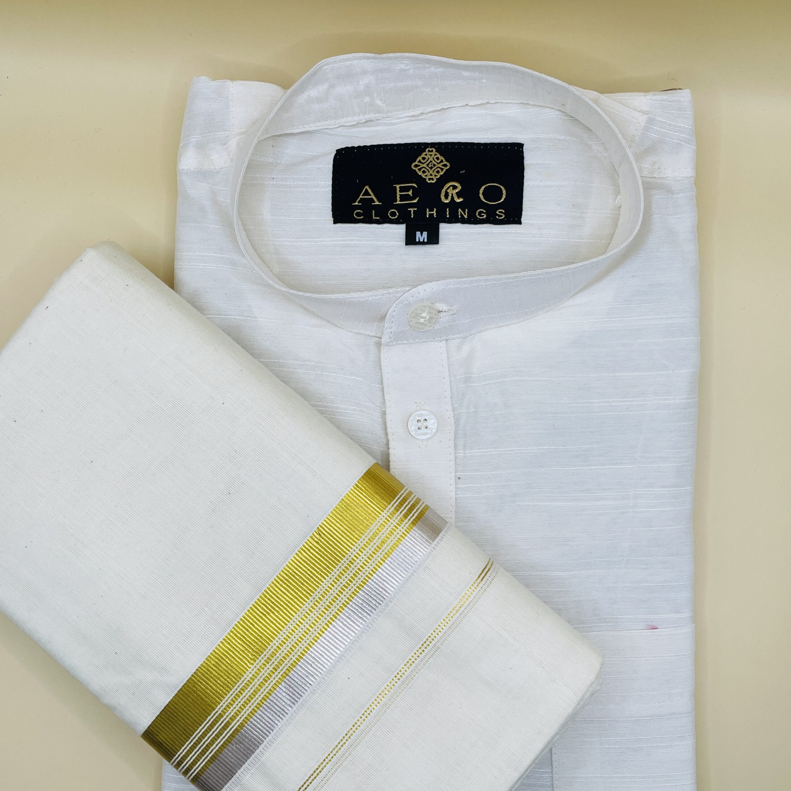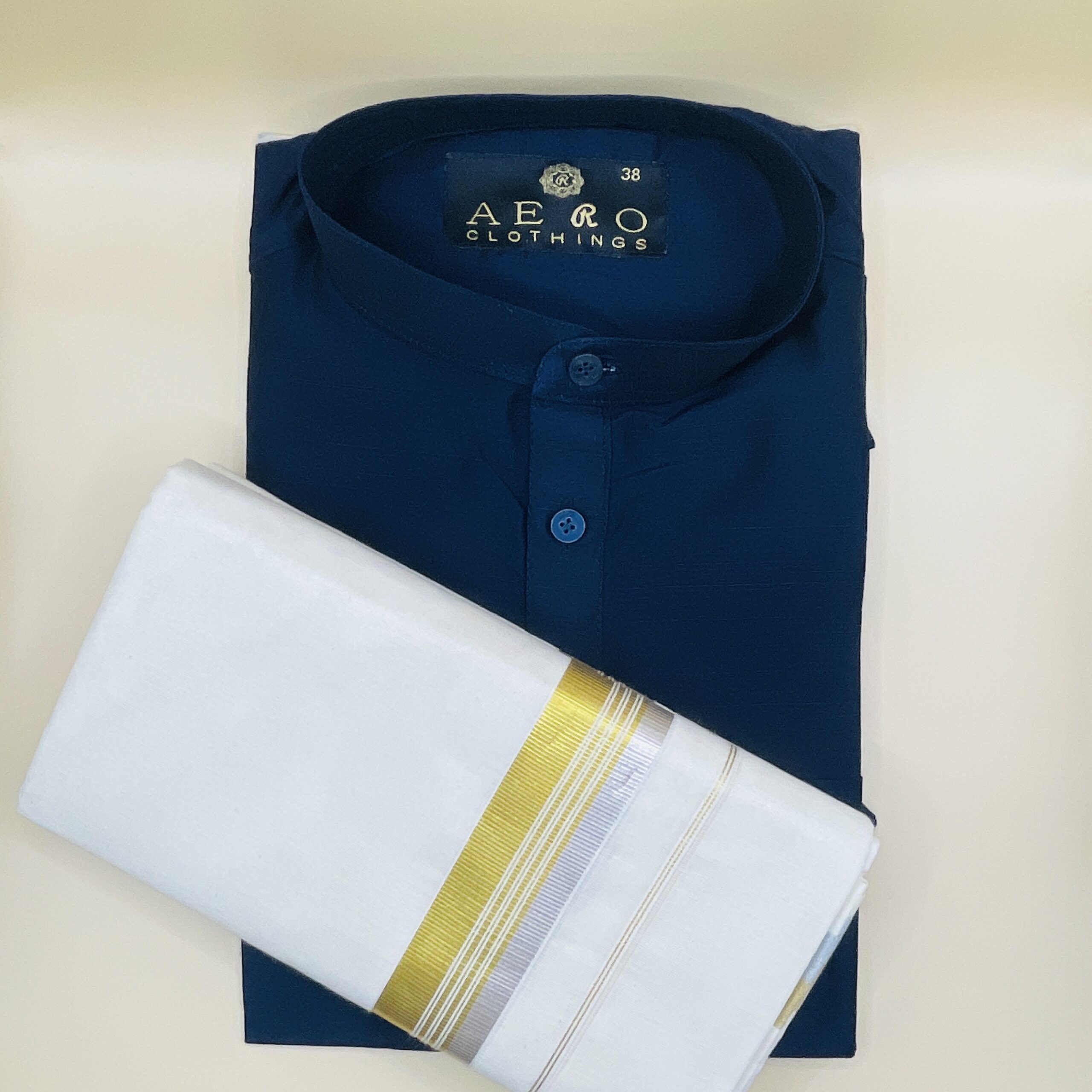 Celebrate tradition in style with this short kurta and mundu combo, designed for the modern man who values comfort and heritage. The solid-colored short kurta with a sleek mandarin collar pairs effortlessly with the classic Kerala mundu, creating a look that is both elegant and versatile. Perfect for Onam, weddings, temple visits, and cultural gatherings, this combo blends ethnic charm with contemporary flair.